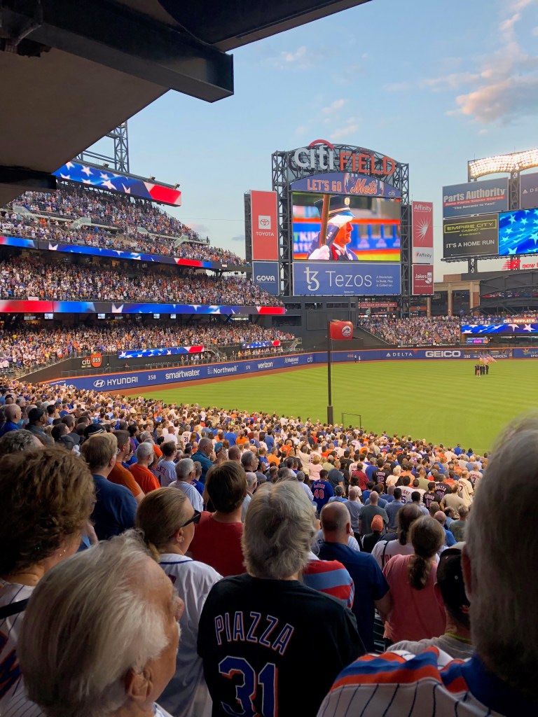 Eight of us converged on Citi Field this past Saturday. Our son, Dan and our granddaughter; my brother Mark (yes, the one who teased me relentlessly and still does, though not relentlessly but is a loyal and loving brother too) and his wife, Pam, their son, Sam (also a passionate Met fan), and my high school friend, Steven, joined us. We took the subway, along with many other Met fans. The first leg of the trip on the 1 line, the subway car wasn’t air conditioned, but fortunately it was a brief ride and not too crowded. We had more luck with the 7 train, it was air conditioned, so we arrived at our destination in relative comfort. The 7 line travels above ground through Queens. I couldn’t help but notice the changes in the borough – so many high rises! The areas we passed have transformed from small residential and industrial neighborhoods to gleaming skyscrapers. New York City is ever-changing.