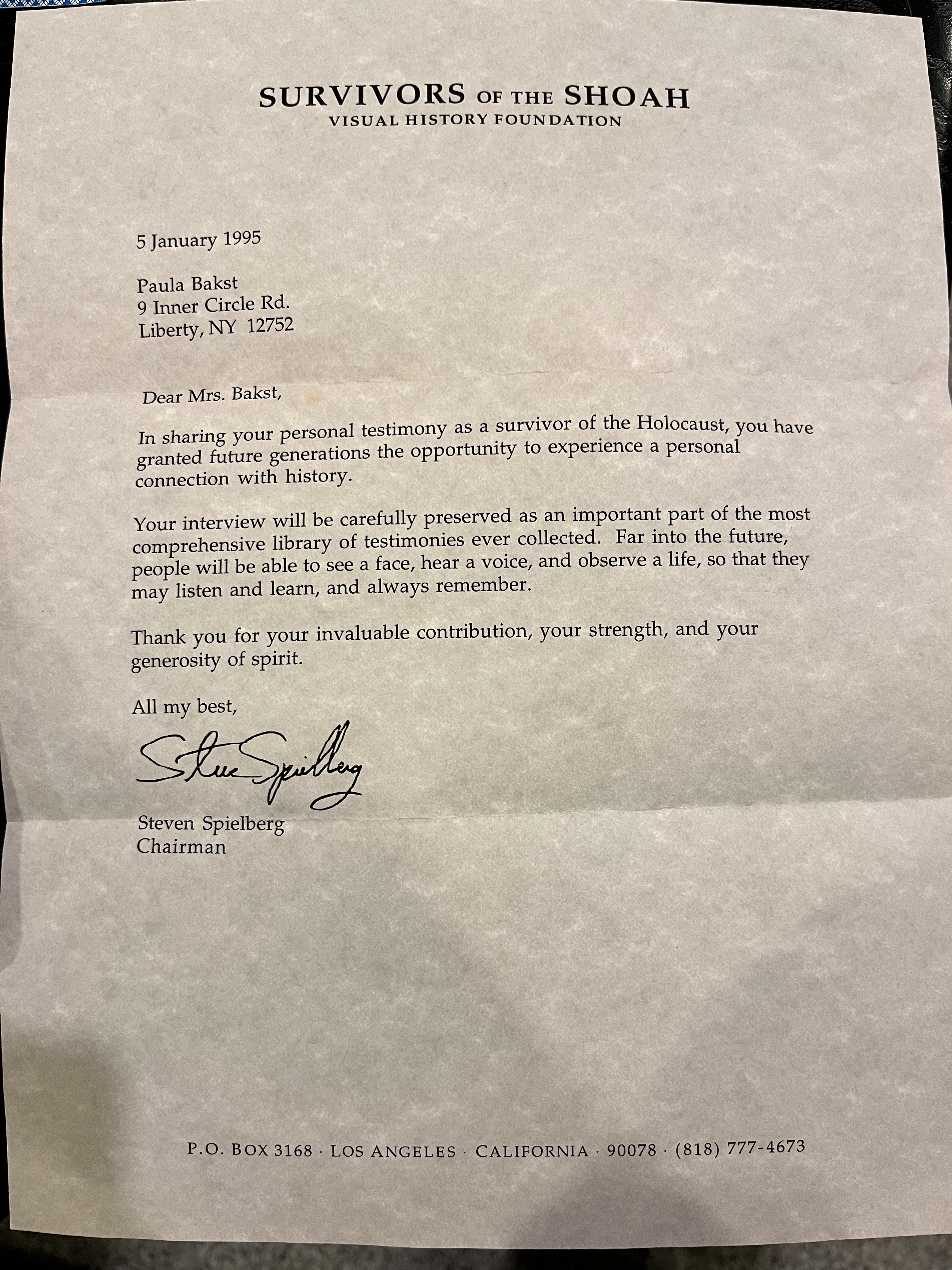 I am writing to thank you for creating the Shoah Visual History Foundation. It has been a gift to my family.