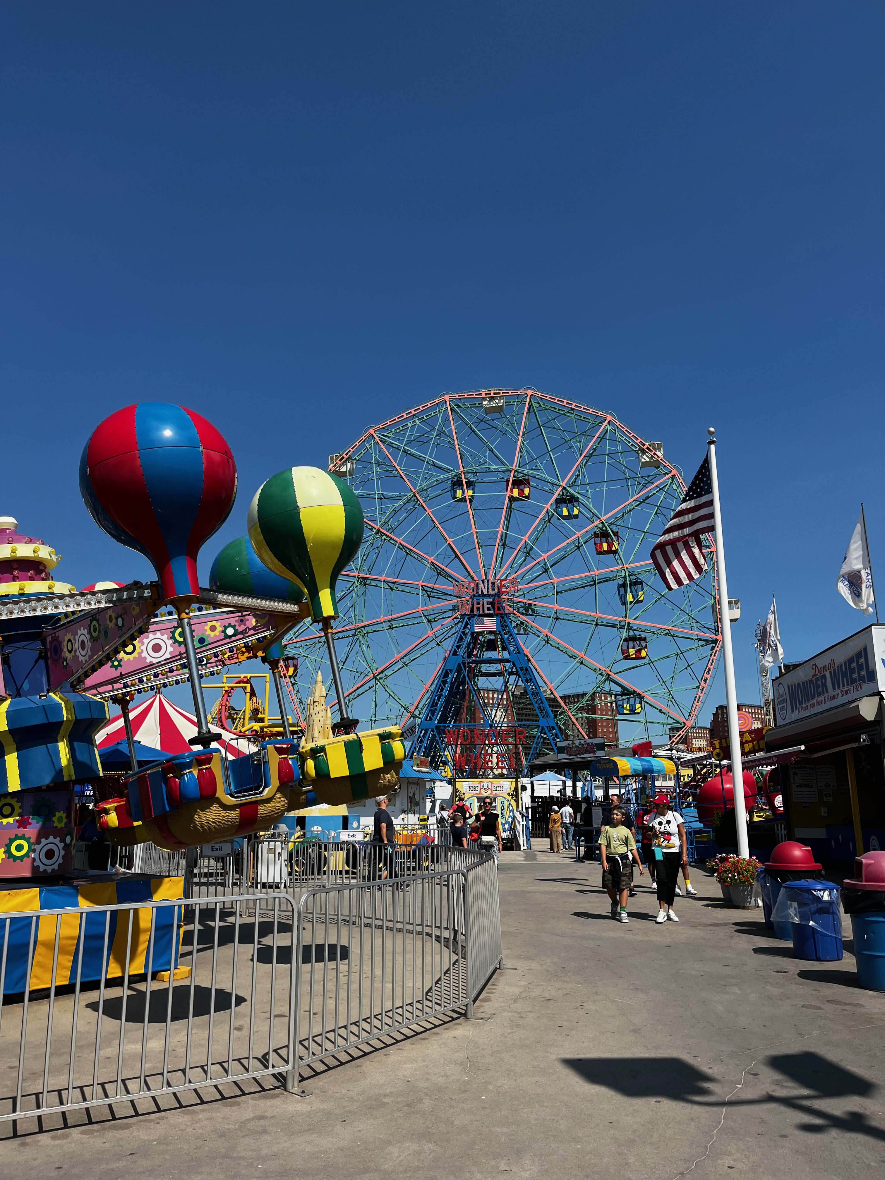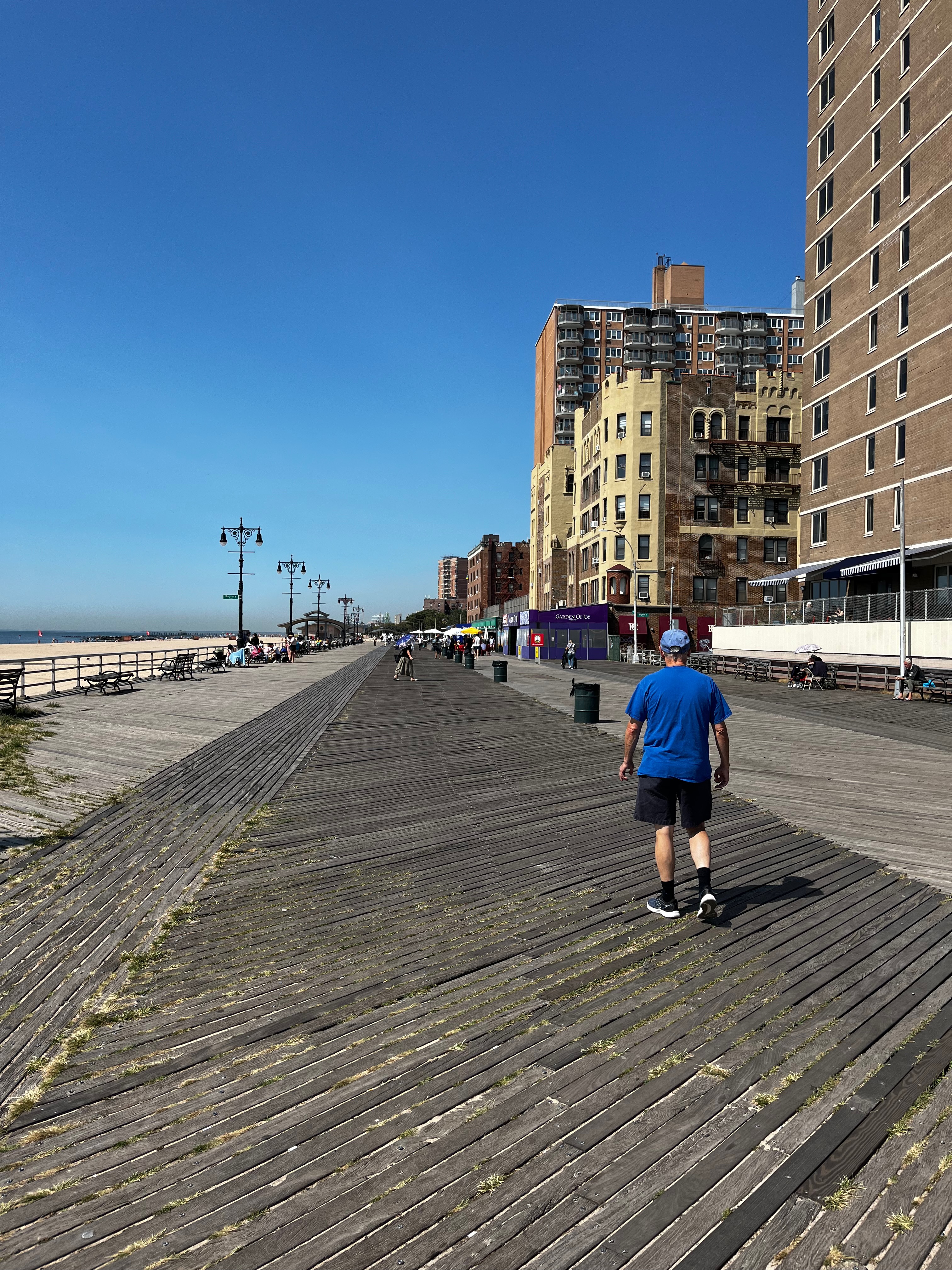 We found an unmetered parking spot on a residential side street. The Riegelmann Boardwalk runs along the beach – named after Peter Riegelmann, the Brooklyn Borough President in the 1920s – it stretches almost three miles through Brighton Beach past Coney Island. We got on the boardwalk where it starts and meandered almost the full length of it, passing iconic landmarks like the Cyclone, Nathan’s and the renovated aquarium. It was not yet noon, so it was quiet, everything was just opening. We passed a few fellow walkers, joggers and fishermen/women. We heard a polyglot of languages being spoken, including Yiddish. The sky was clear, there was a warm breeze, and the water glistened in the sunshine. We stopped to watch the waves breaking on the shore. Only a few umbrellas dotted the sand – public schools in New York City had opened that day so there weren’t very many people.