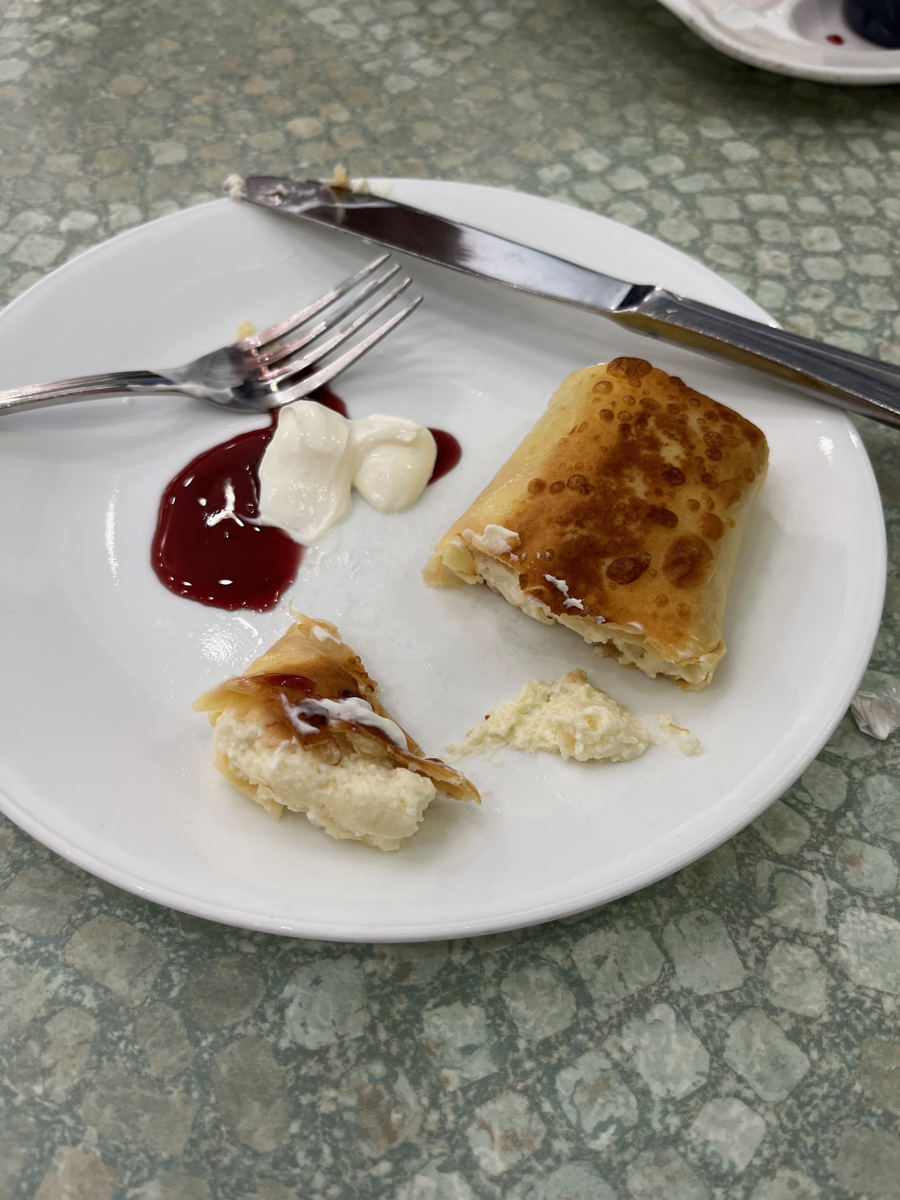 There were just a few empty tables, so it seemed to be a popular place for the locals who were speaking a Slavic language to the waitstaff. We ordered stuffed cabbage as an appetizer, chicken kebab with mashed potato and cheese blintzes, we shared each dish. The food was excellent.